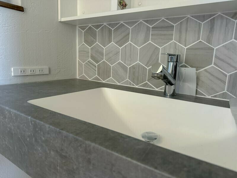 明るすぎない洗面とアクセントタイル
