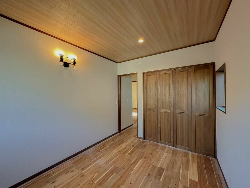 木の風合いをとことん生かした寝室。可愛い人型?のブラケットライトがアクセントです!