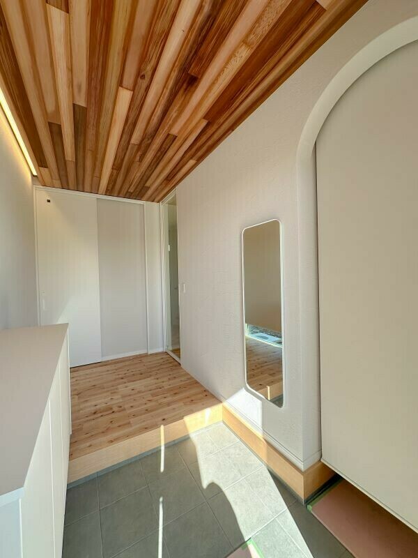 ⑤玄関ホールの木の天井と間接照明と塗り壁でつくった雰囲気