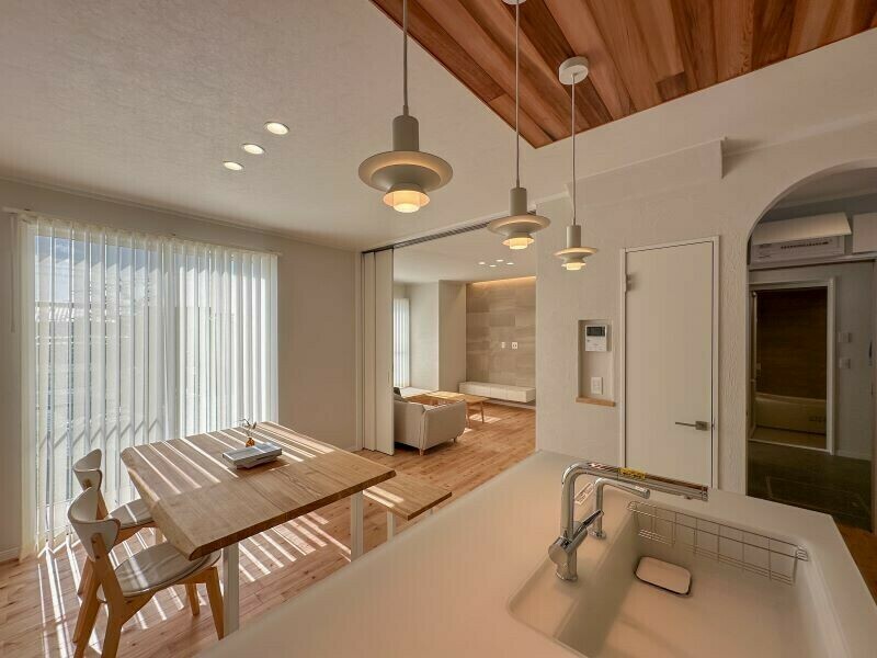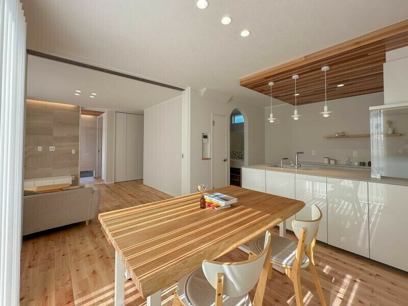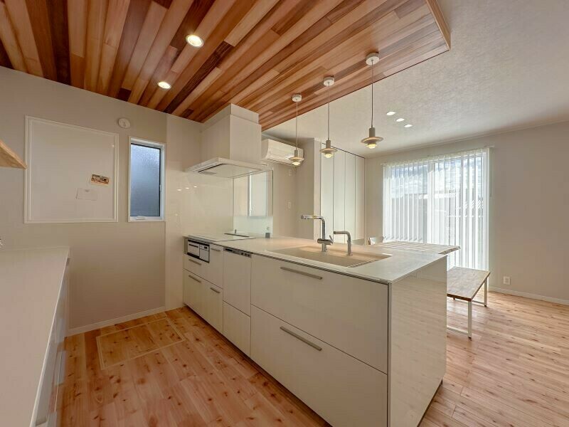 TOTOのハイグレードキッチン「ザ・クラッソ」をご採用。シンプルでお手入れしやすい高性能さが特徴です。対面側は収納付きになっています。真っ白な美しさが、無垢の折り下げ天井によく映えます。