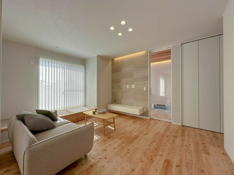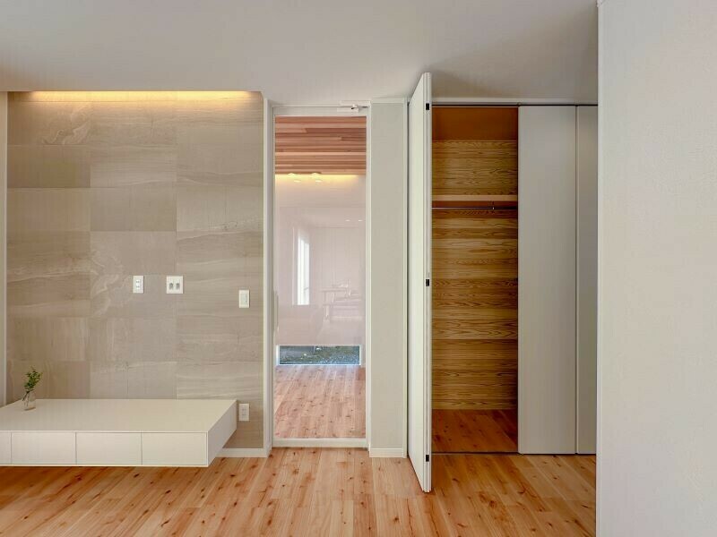 ハイドアをご採用いただいたので、扉というよりもまるで壁がそのまま移動する感覚です。すっきりとした空間デザインが特徴。