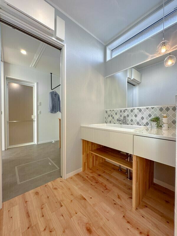 洗面と脱衣の空間をわけて、リビングやキッチンから回遊できる間取り動線にしました。