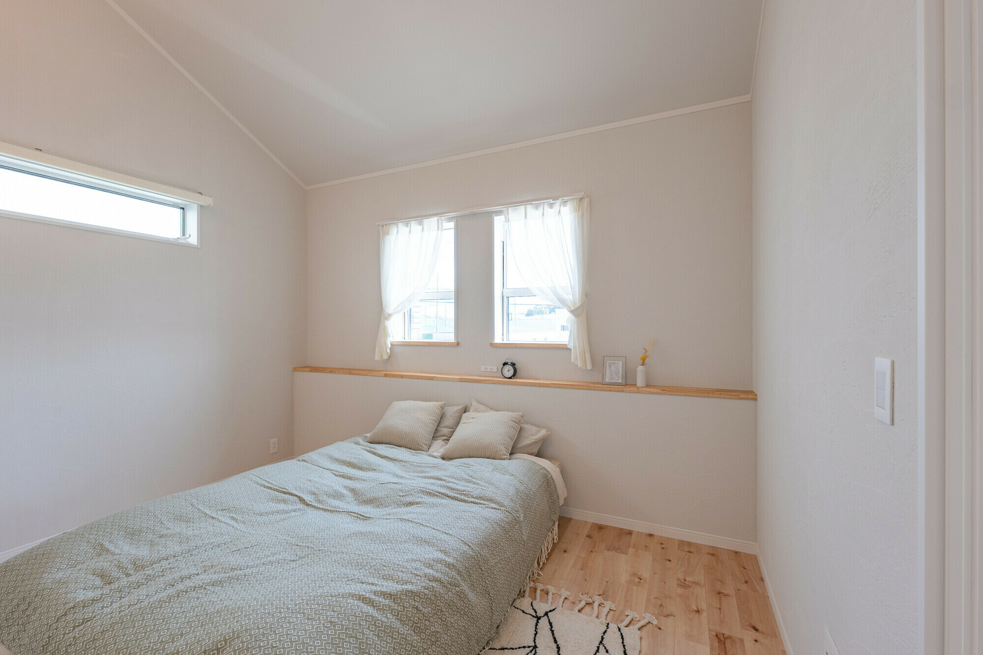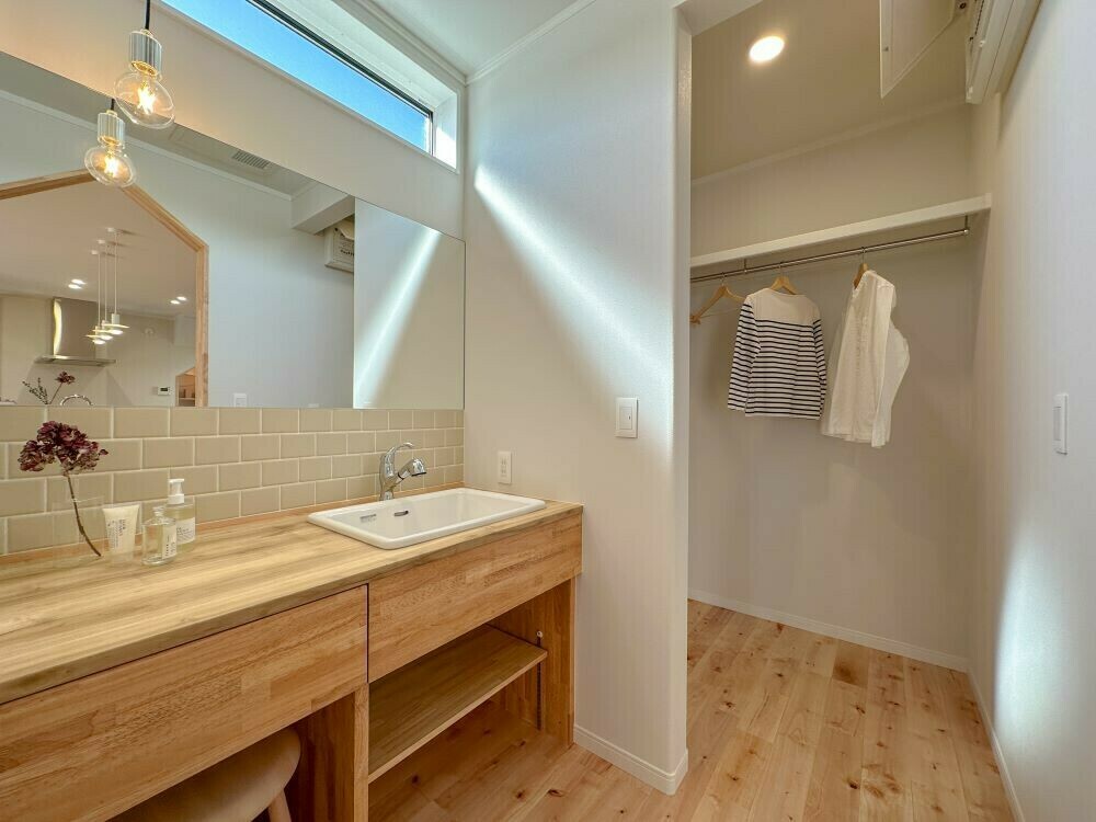 無垢床や塗り壁といった自然素材の温かみを存分に生かした、シンプルでやさしい色合いが特徴のモデルハウスです。