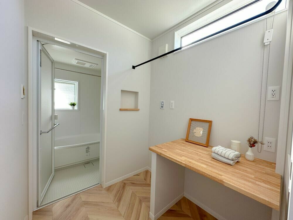 脱衣室には簡易物干しと作業台を設置してあります。