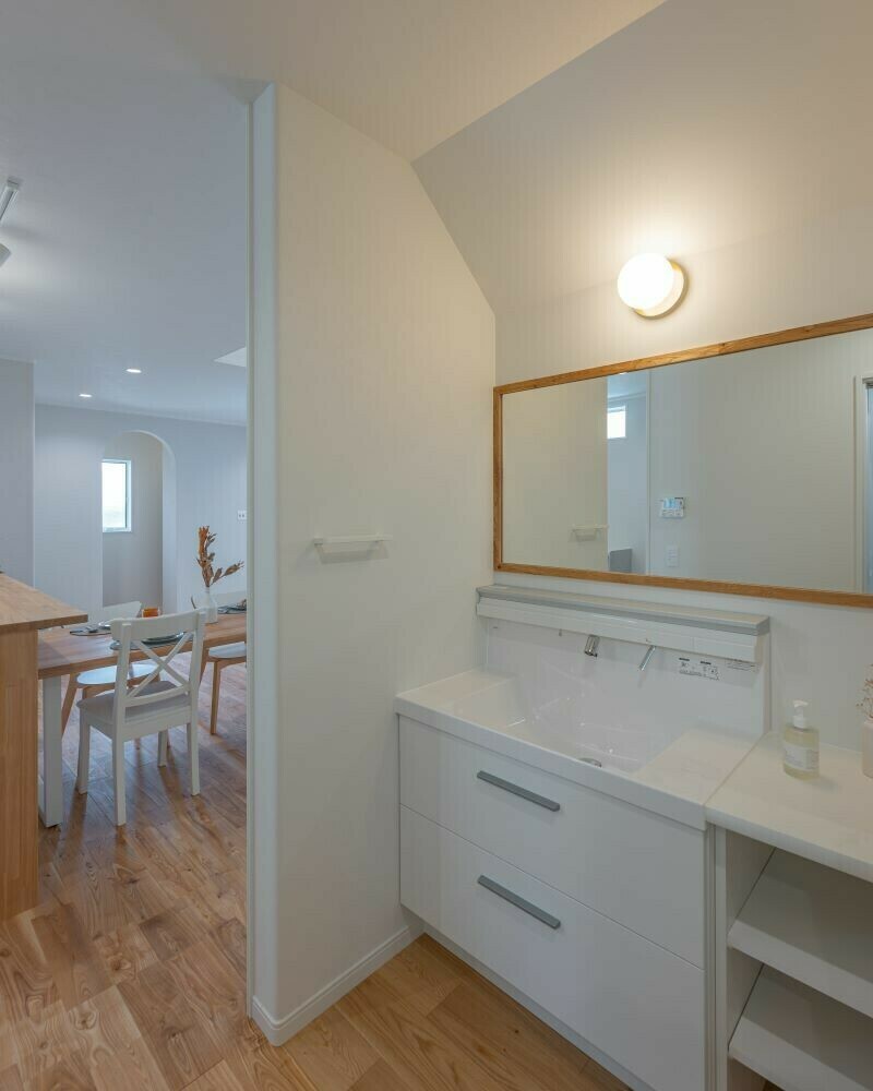 洗面台は脱衣所と分離。階段下の空間を有効活用しています。洗面化粧台はメーカー品を生かして半造作にしました。