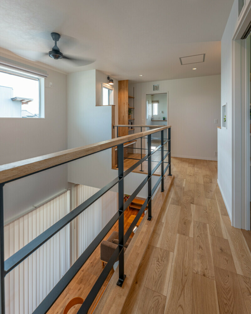 アイアン手摺のおかげでより広々開放的な空間に。2Fホールは一部フリースペースになっています。