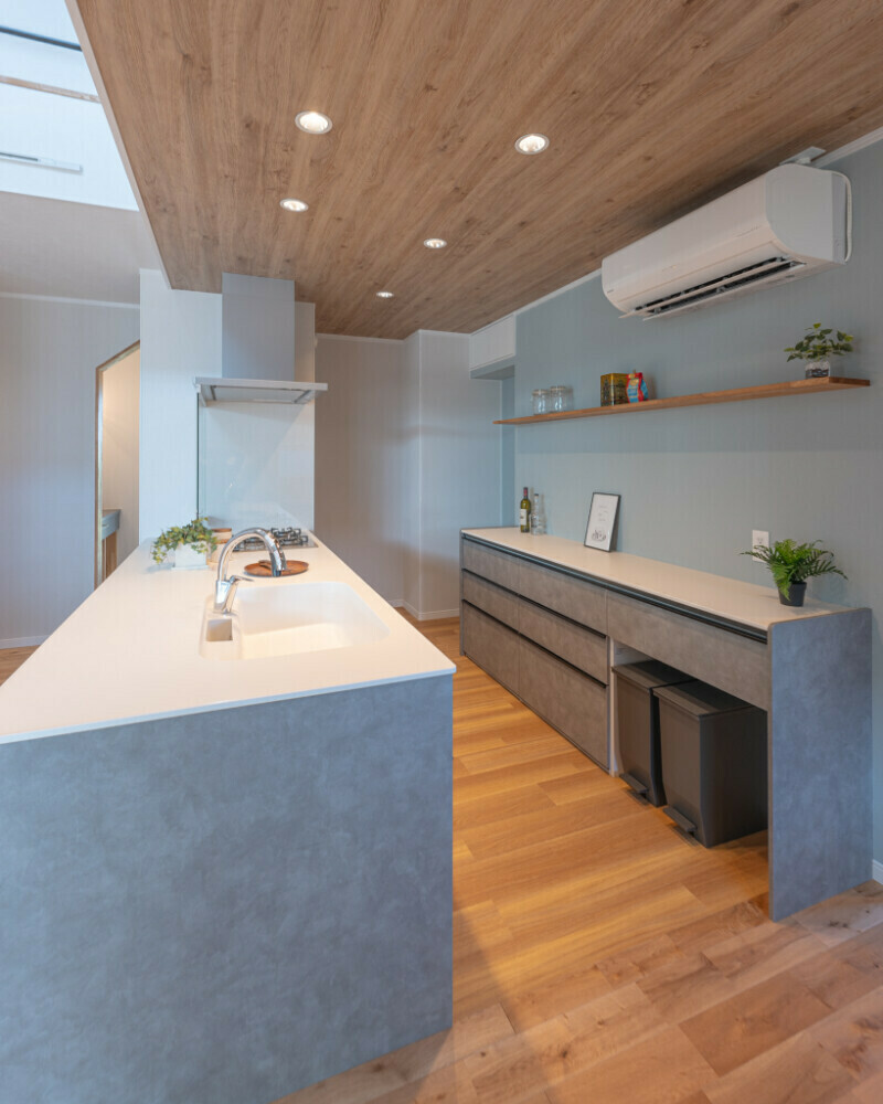 キッチンはぐるりと回れる回遊動線になっています。オープンのペニンシュラキッチンで開放感も忘れず!