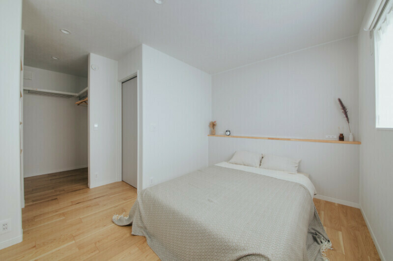 寝室にはウォークインクローゼットと可動棚を設置。収納スペースには扉を付けず、居室空間とゆるやかに繋がることで室内が広く見える工夫も。