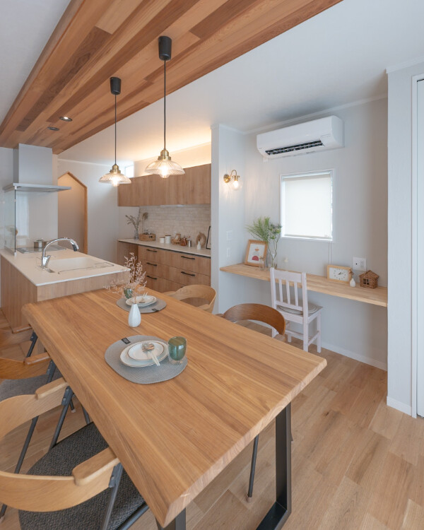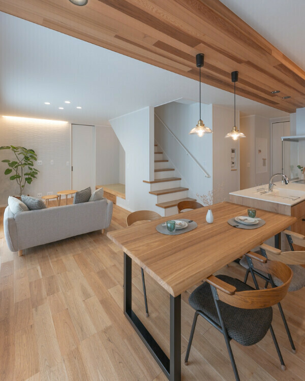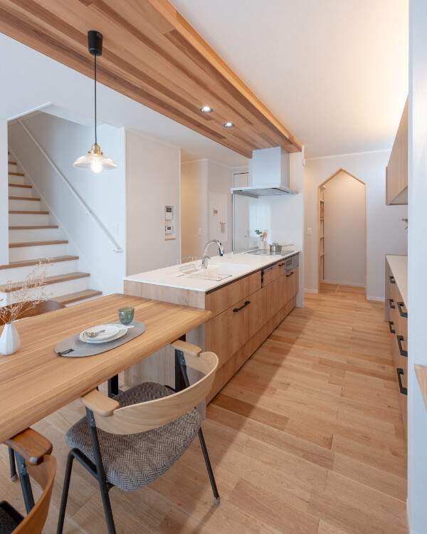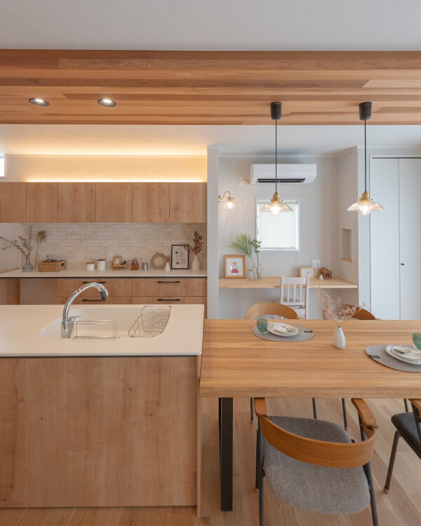 木の素材感を生かした温かみのある雰囲気、キッチンや洗面のおしゃれな風合いが見どころです。