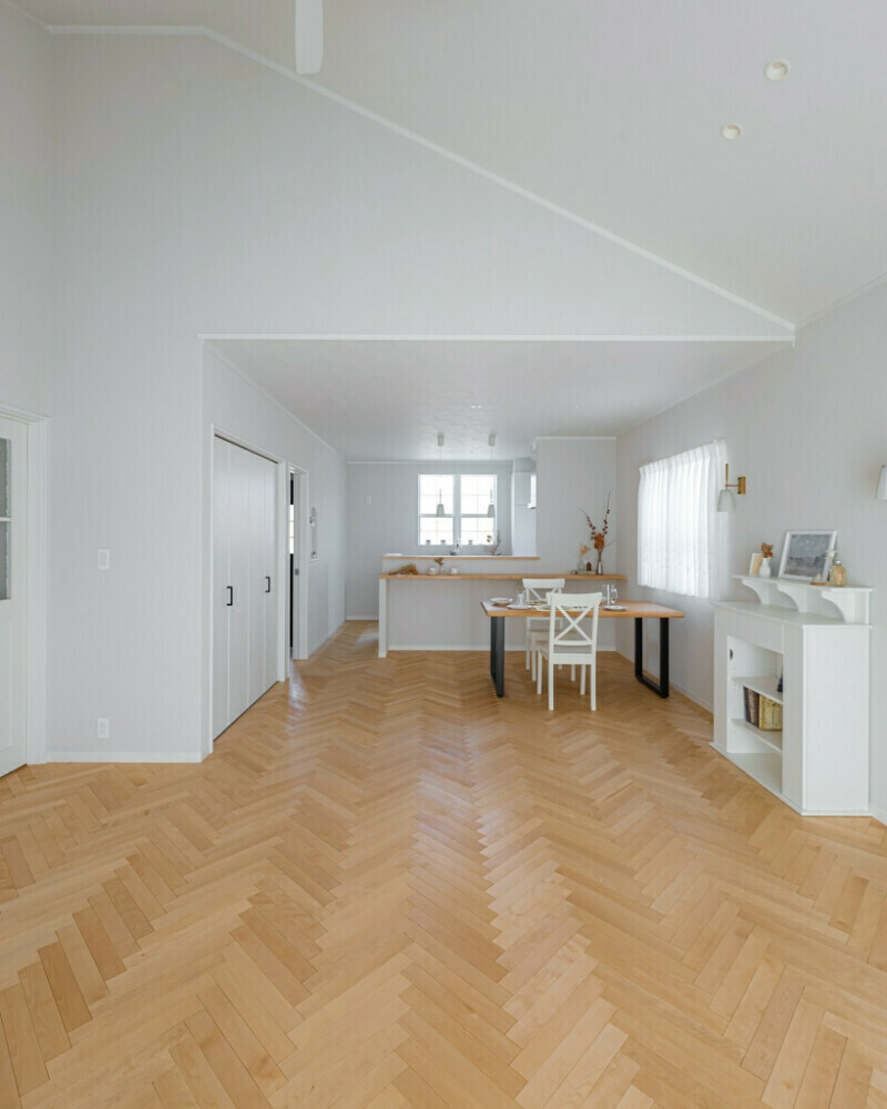 ヘリンボーンの無垢床がとても美しいです!