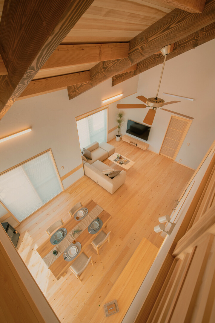 吹き抜けのLDKと小屋裏2Fがひと繋がりになっている、大空間が印象的な平屋風の間取り。