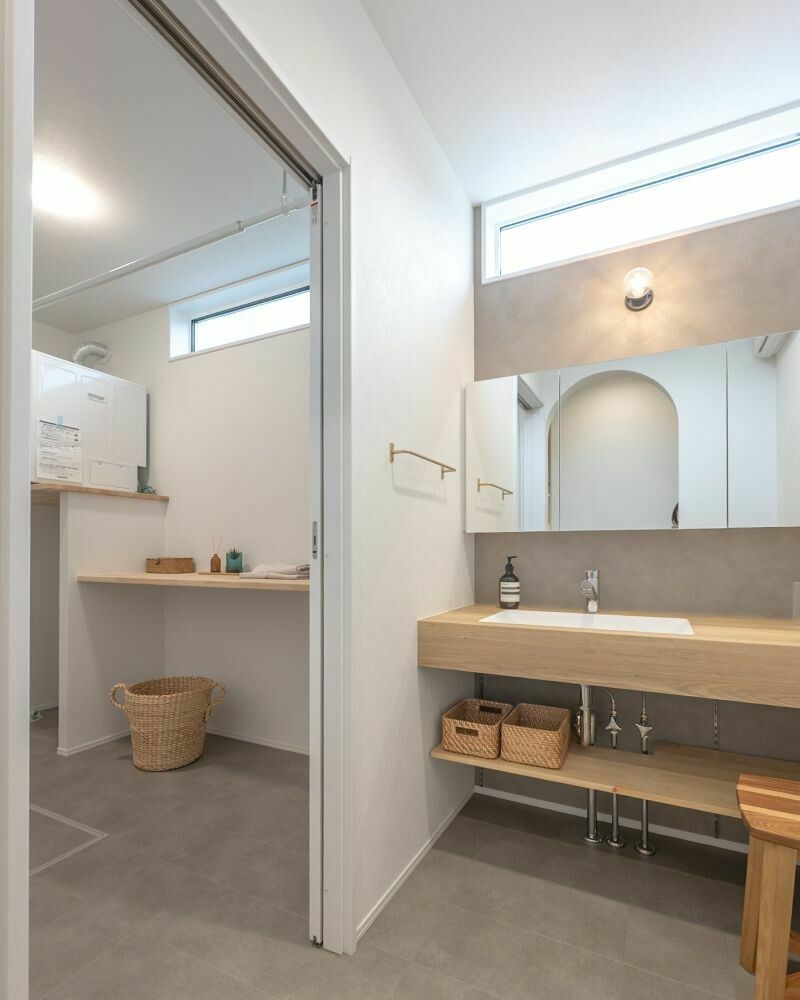 洗面と脱衣は分離させています。洗面は落ち着いた色味でコーディネートした造作洗面です。