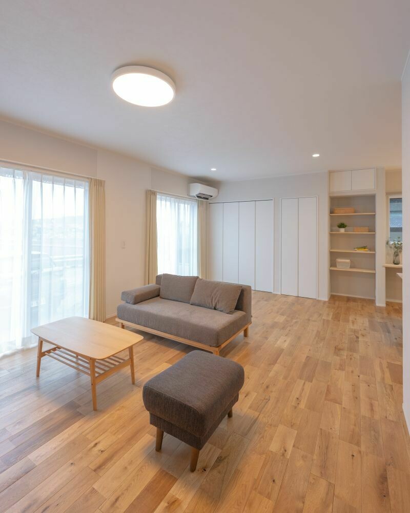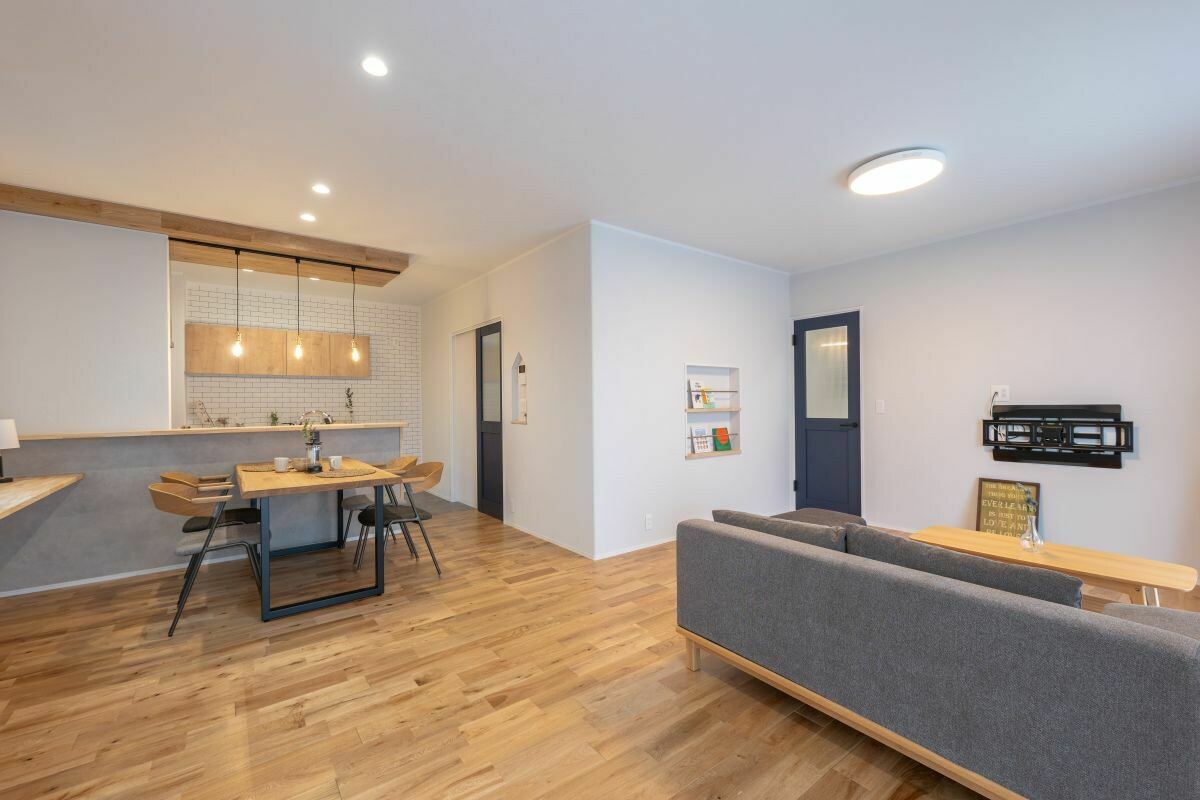 窮屈さを感じさせない広さと、家中を回遊できる間取りで生活の拠点となるリビングとなりました。壁には絵本用のニッチを📚