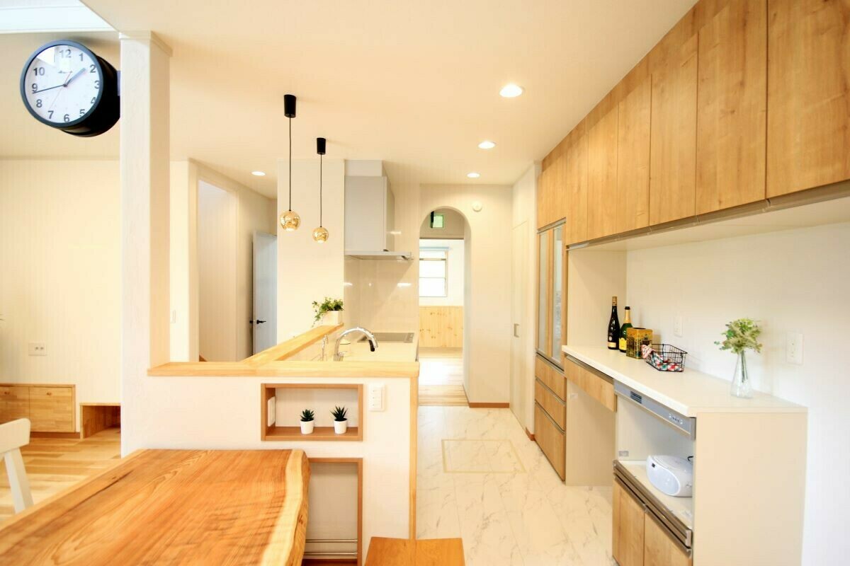 リビングに入ると吹抜けの大空間が目の前に広がる、とても開放的な住まい。明るい陽射しが差し込む寛ぎのリビングは、カバザクラの無垢床と無添加シラス壁の調湿効果で、床はサラサラ、蒸し暑い夏も快適です。冬はペレットストーブで体の芯から暖かく過ごせます。