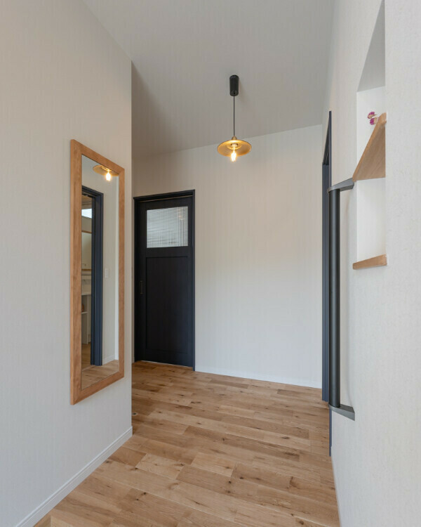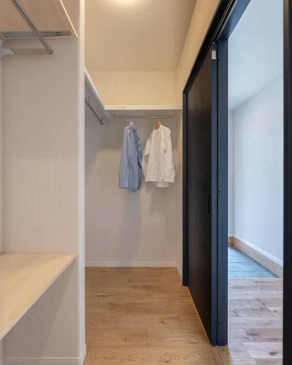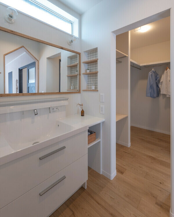 ガス乾燥機を使って洗う・乾かす・しまうを最短で完結できる洗濯動線、洗面を通ってファミリークローゼットへ、そのまま身支度して玄関へ抜けられる回遊動線。
