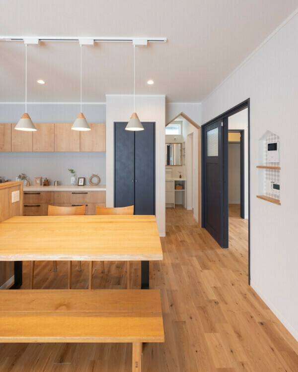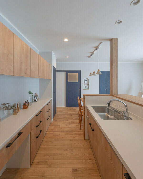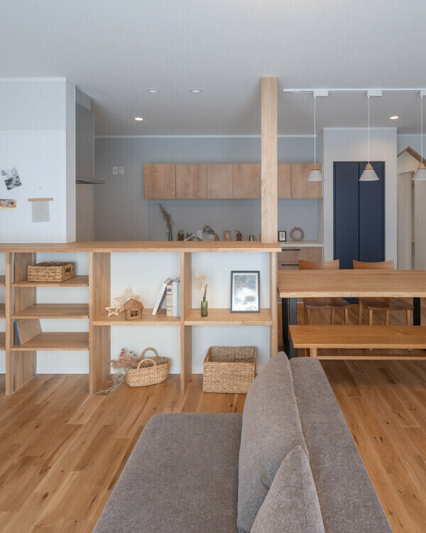 キッチン前のおもちゃ棚には、子どもたちが自然と片付けたくなる工夫が詰まっています。