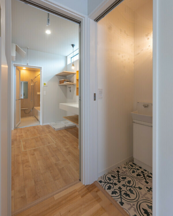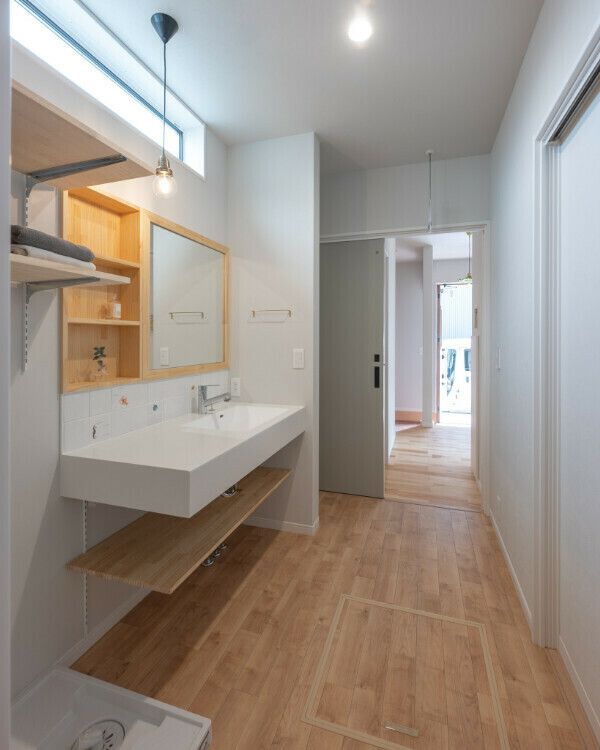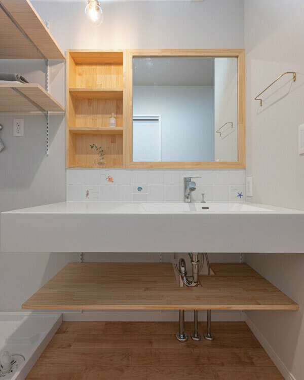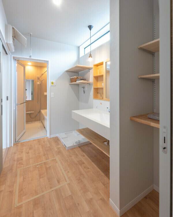 ゆったりとした広さの洗面脱衣室には、タオルや下着類の収納スペースも確保しました。