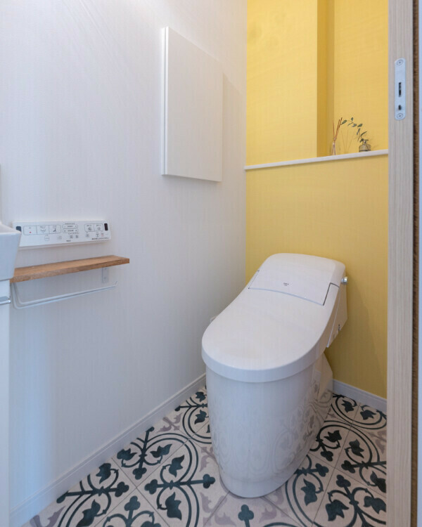 可愛らしいお魚が描かれた洗面のタイルは、イラストが趣味の奥さまがこだわって選んだもの。