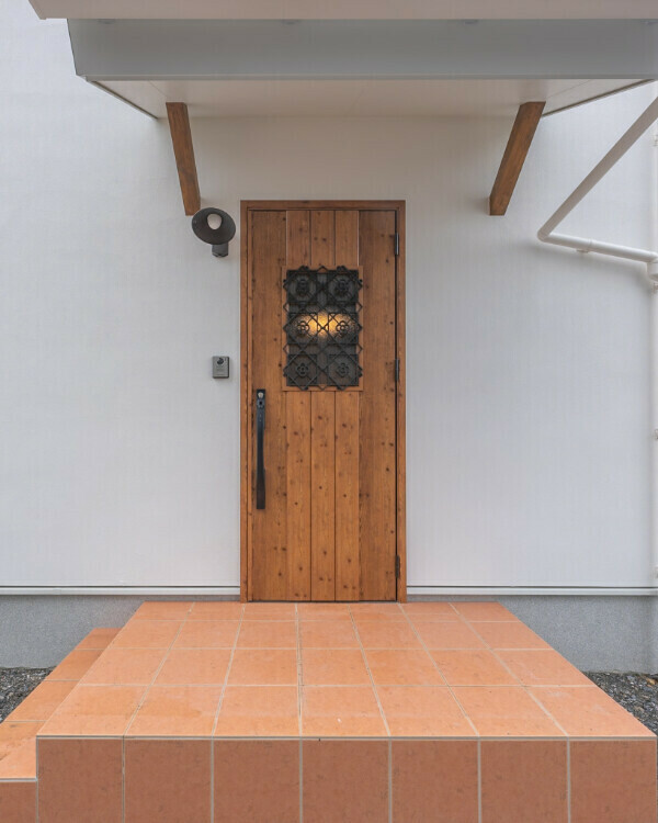 ドイツでの思い出を感じさせるテラコッタタイルとグリーンの小窓付きドア。素敵な玄関が、訪れる人を温かく迎えてくれます。