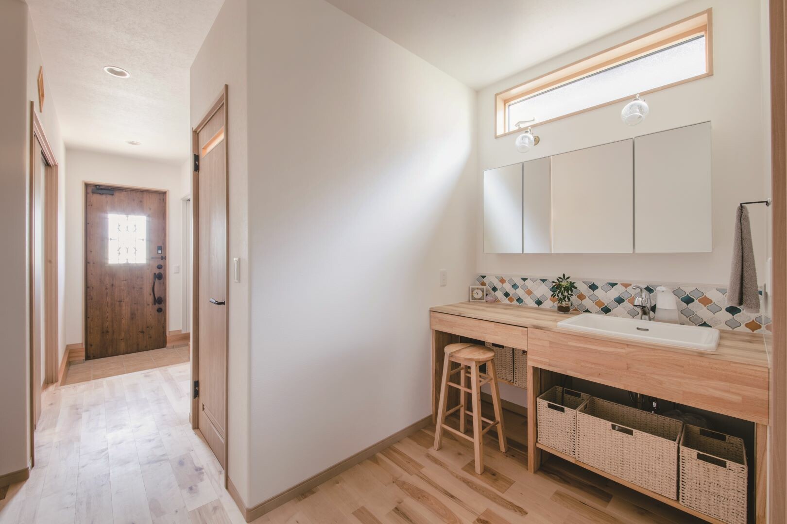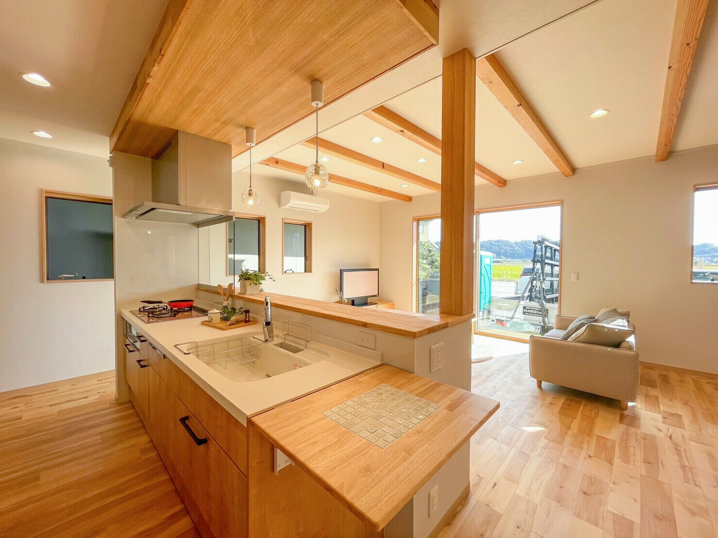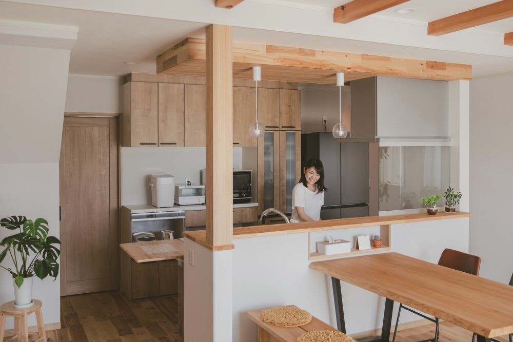 特にこだわった部分は、キッチンが中心にあるLDK。キッチンを囲んで家族団らんの時を過ごしたいという想いからこの間取り至りました。回遊動線になっているので家事もしやすいです。シンク横には折り畳み式のミニカウンターを造作しました。奥さまお気に入りのモザイクタイルを中心にはめ込んでいます。