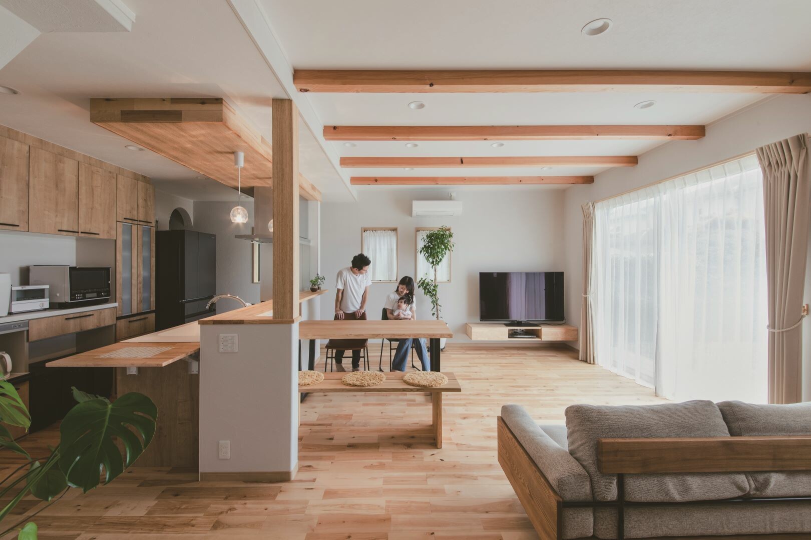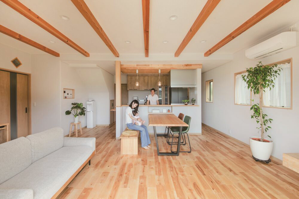 家事育児に熱心なご夫婦が、間取りを考える上でいちばん大切にしたポイント、それは「家族みんながいつも楽しく一緒にいられる家にしたい」ということ。キッチンを中心とした回遊動線や、ゆっくりとくつろげる2階のセカンドリビング、そしてひみつの小屋裏スペースなど、家族が集える空間づくりを大切にしました。