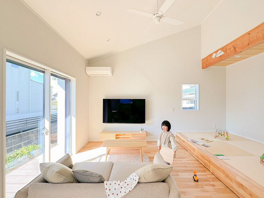 毎日が忙しい共働き世帯のご家族が、日々の暮らしやすさを第一に考えた1.5階建て風の住まい。