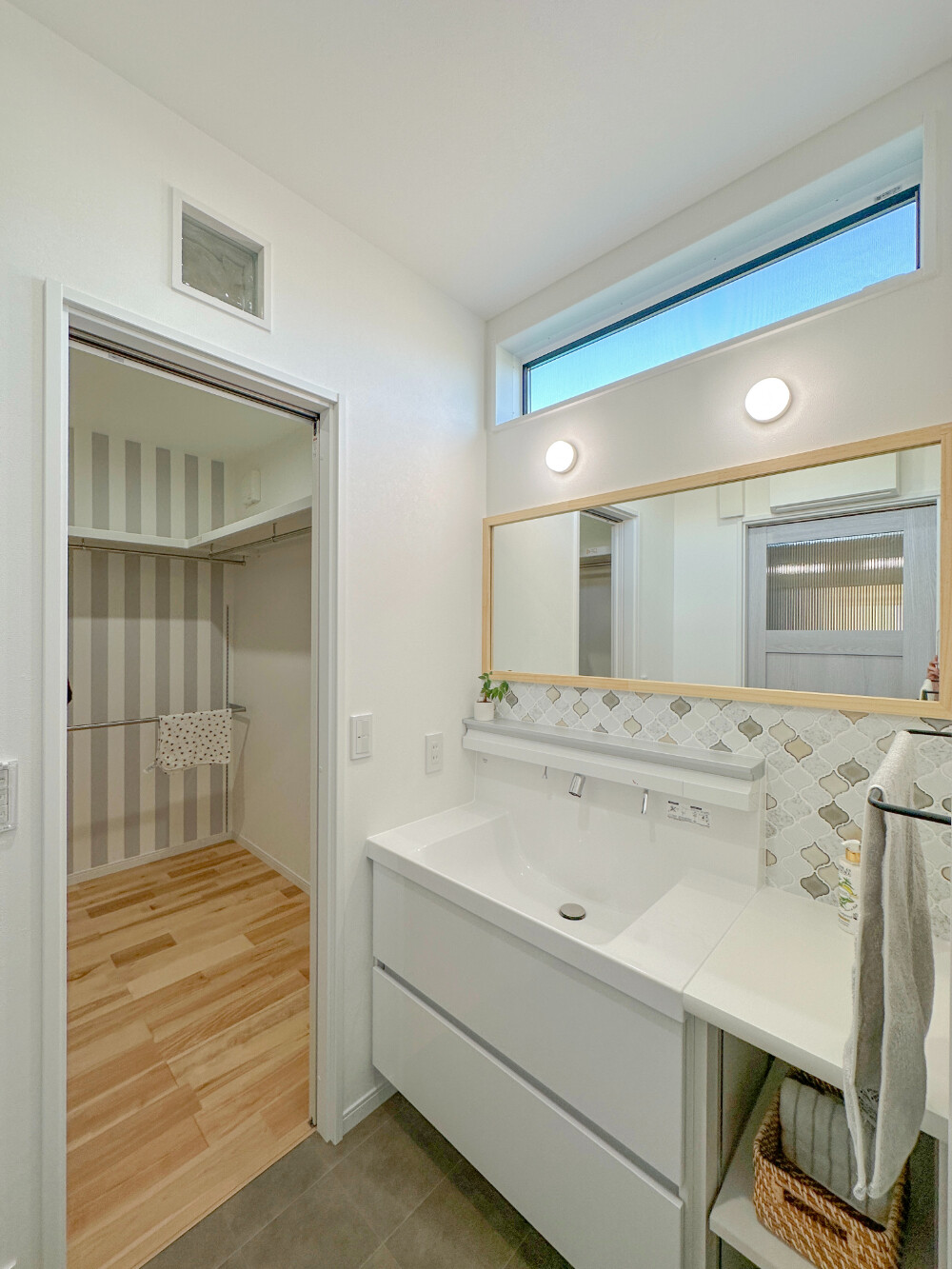 水回りはファミリークローゼットを含めて一直線の動線に。収納スペースも豊富な家族が暮らしやすい快適な住まいが完成しました。
