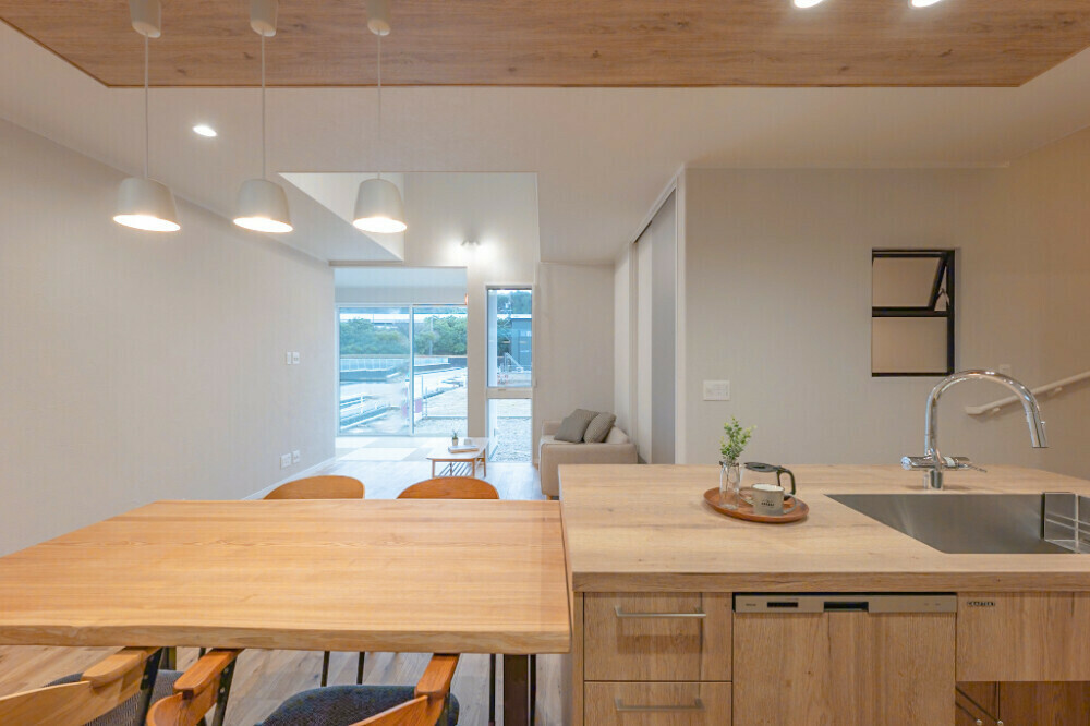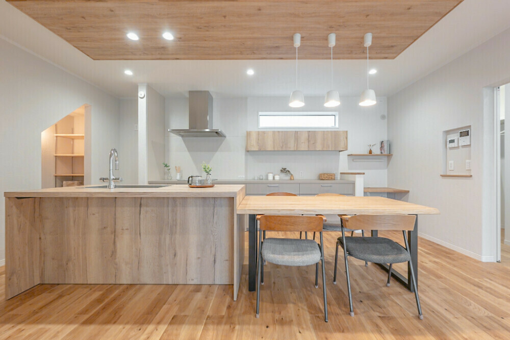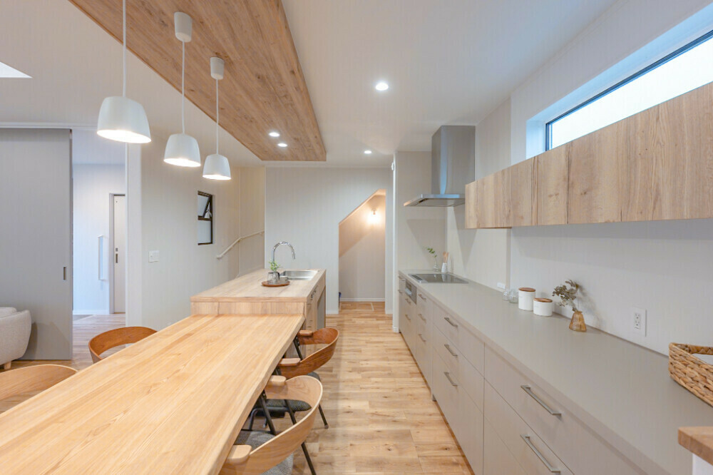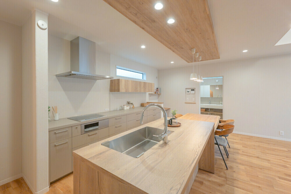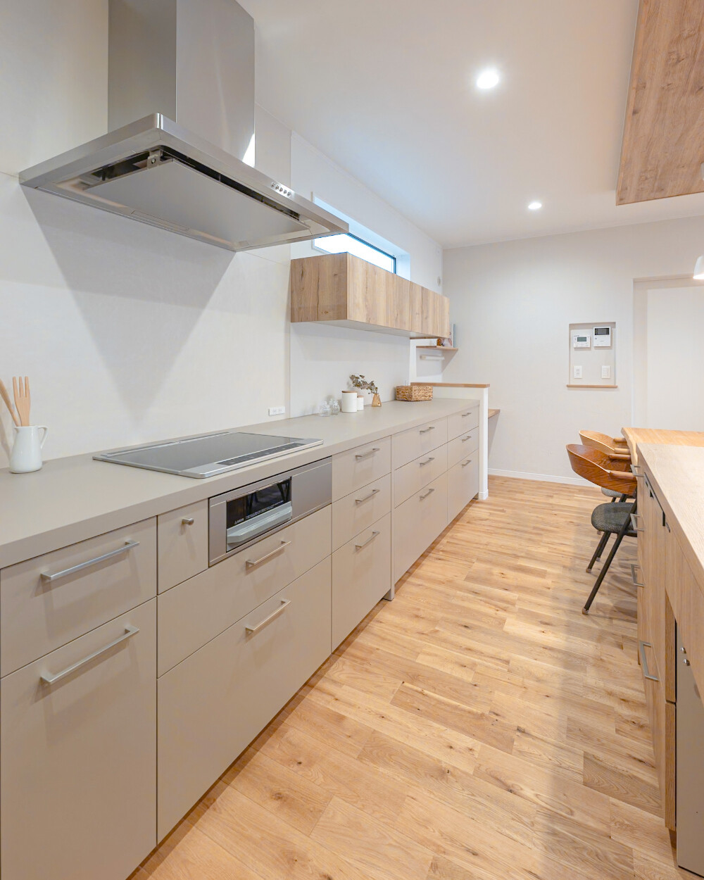 キッチンからリビングを見渡せる配置を希望されていたお施主様。当初は開放感を感じられるアイランドキッチンを希望されていましたが、「料理の途中に子どもが急にコンロ回り近づいてきたら危ない」ということでII型のキッチンをご採用。コンロは壁側に、シンクだけ対面配置となっています。