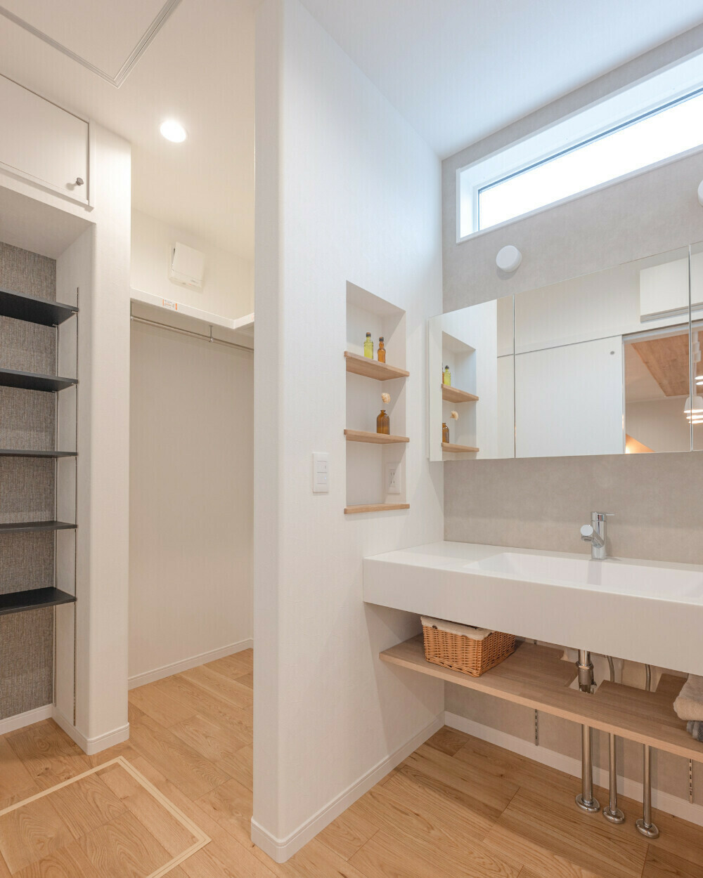 子どもが小さいうちは、洗面浴室はリビングから近いほうが利便性が高いということで、洗面はダイニングのすぐ隣にしました。
