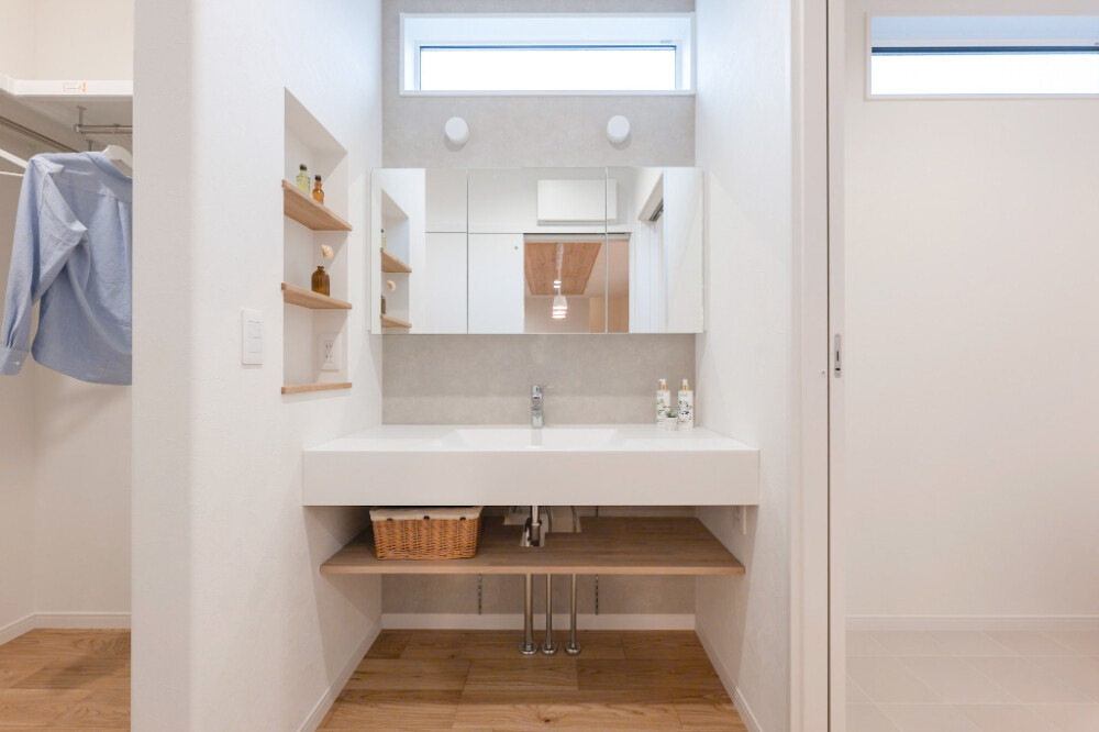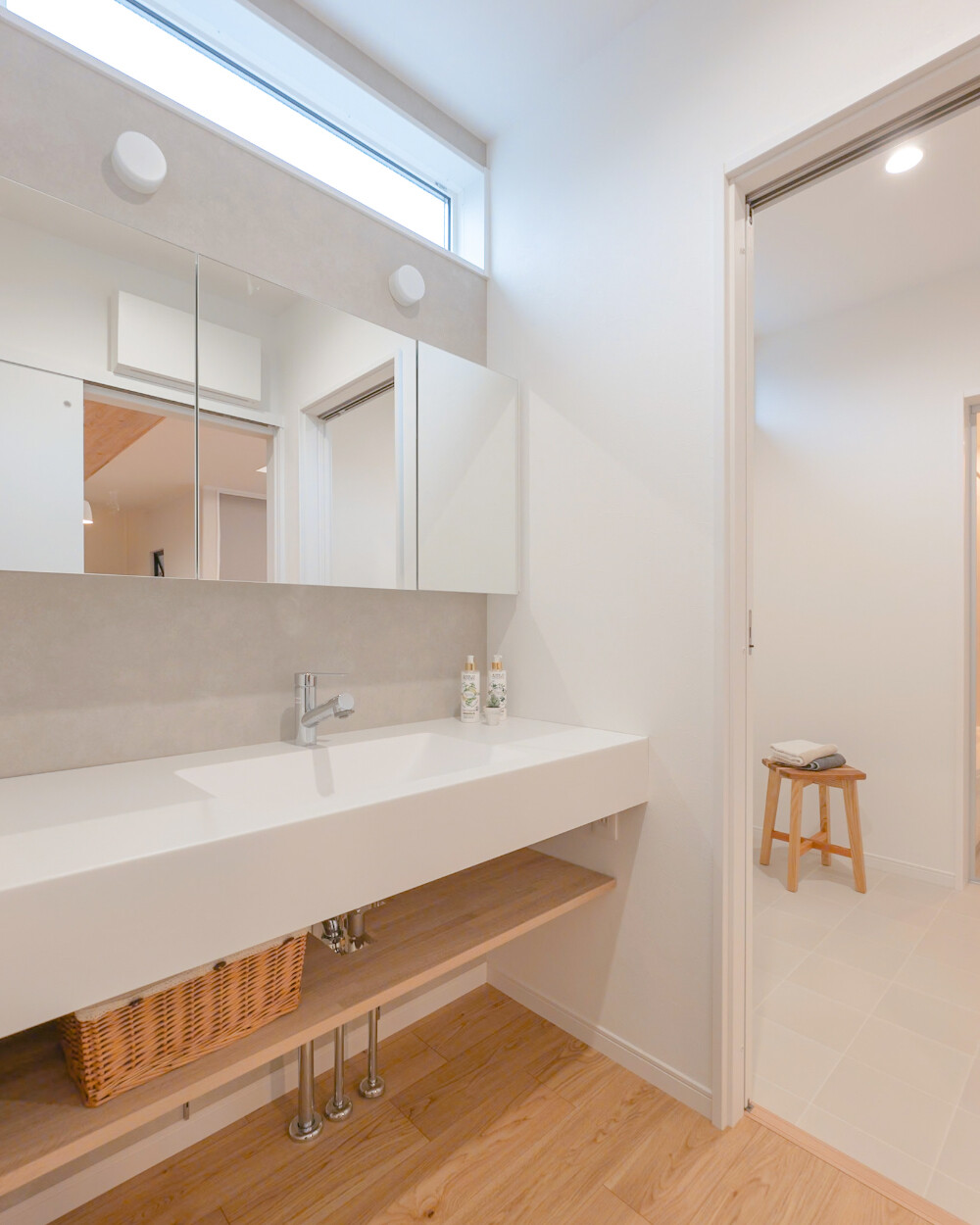 洗面化粧台はアイカのスマートサニタリーをご採用。三面鏡はサンワカンパニーです。