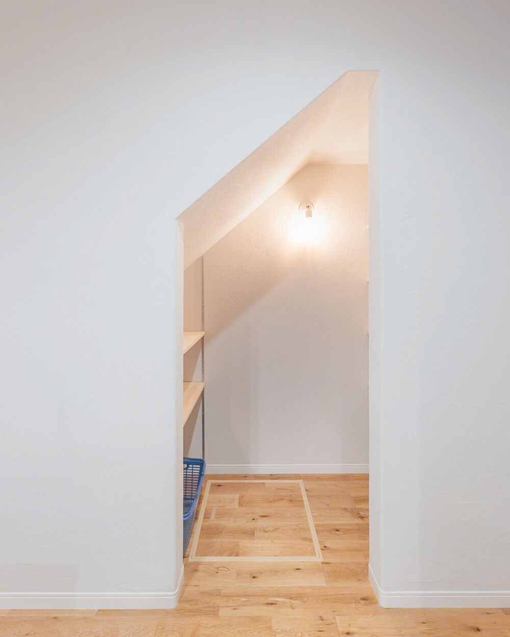 広々としていて使い勝手良好。突き当りは階段下のスペースを有効活用したパントリー収納です。