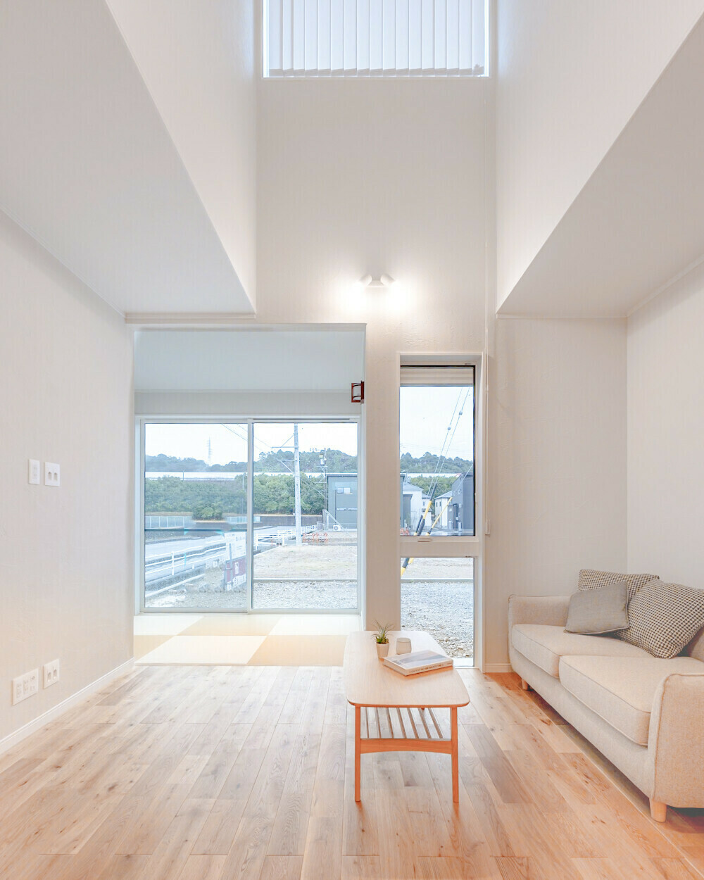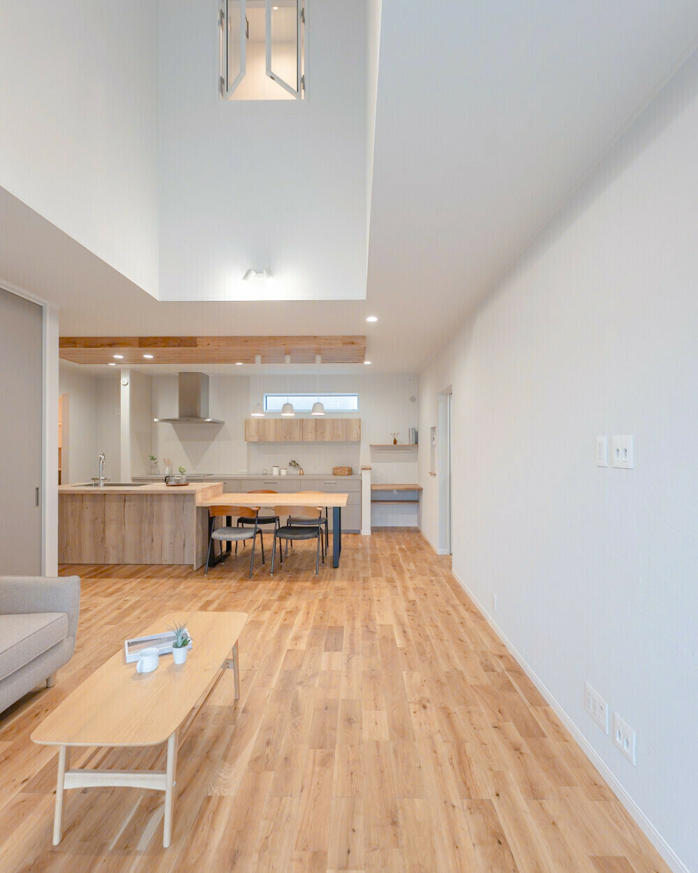 リビングの一部を吹き抜けにし、扉はハイドアを採用して開放感を演出。